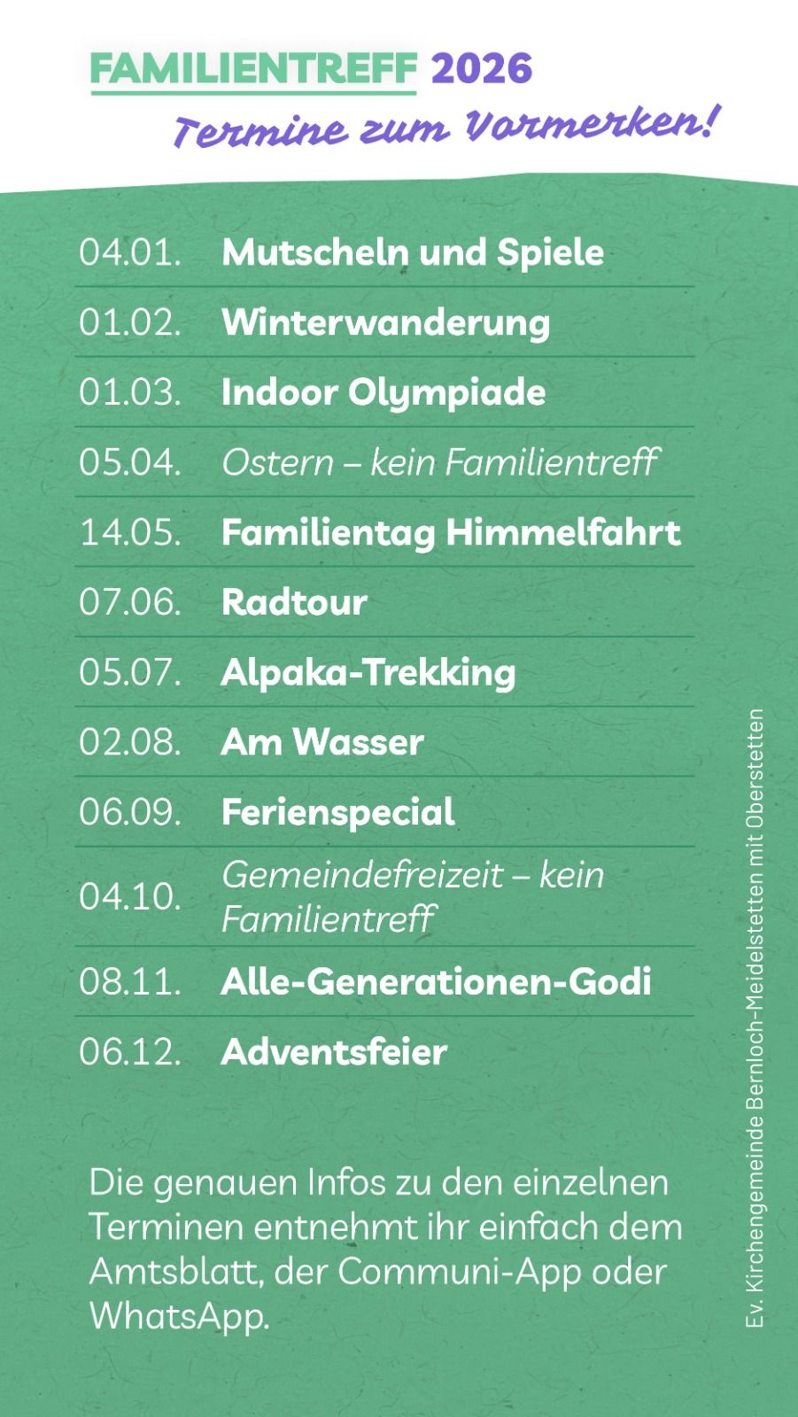 Freitag, 30. Januar 2026 17.30 Uhr Mädchenjungschar Bernloch im Gemeindesaal 17.30 Uhr Bubenjungschar Meidelstetten [...]